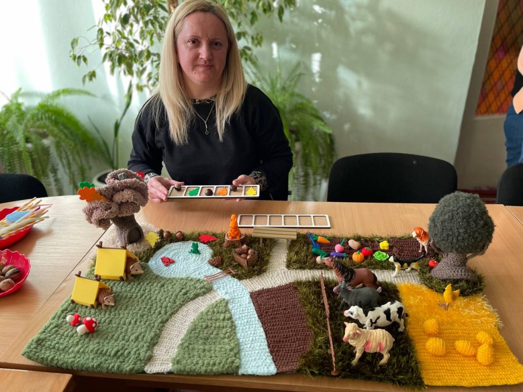 Особливу увагу викликав її сенсорний в’язаний килимок, який Катерина Іванівна продемонструвала як ефективний інструмент для розвитку мовлення, дрібної моторики та пізнавальної активності дітей, та продемонструвала його застусування на практиці.