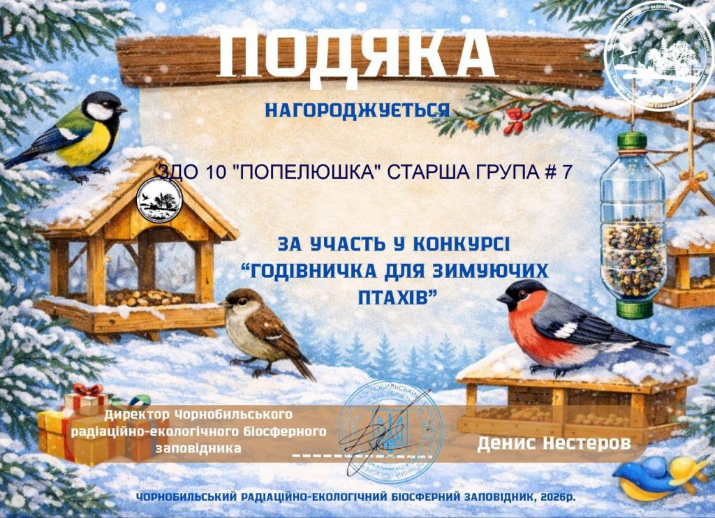 Вихованці старшої групи №7 “Соняшник” ЗДО №10 «Попелюшка» отримали Подяку за участь у конкурсі «Годівничка для зимуючих птахів», організованому Чорнобильським радіаційно-екологічним біосферним заповідником.