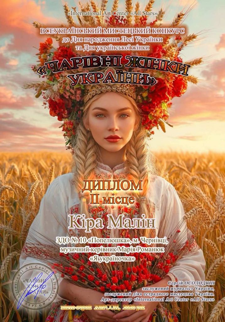 Вихованка ЗДО №10 «Попелюшка» м. Чернівці Кіра Малін здобула ІІ місце у Всеукраїнському мистецькому конкурсі до Дня народження Лесі Українки та Дня української жінки «Чарівні жінки України», який проводив International Art Center «All Stars».